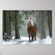 Braunes Pferd im Winterwald mit Schneefall Poster
