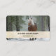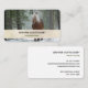 Eine Visitenkarte mit einem Foto eines braunen Pferdes mit einem langen weißen, scheußlichen Mann. Stehend in einem Wald mit Schneeflocken, die überall herumfallen.