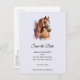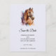 Save the Date Postkarte mit einem braunen Pferdekopf mit einem Trägerportrait aus Leder. Schönes majestätisches Tier.