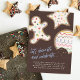 Lade Kinder jeden Alters ein, Weihnachtskekse zu schmücken und die Weihnachtszeit mit diesem festlichen Keks zu feiern, der die Party Einladung schmückt. Cookies in Form eines Lebkuchenmannes, eines Sterns und eines Kreises sind spielerisch mit Zuckerguss und einer Vielzahl von bunten Sprinklen dekoriert. Die Illustration wird auf braunem Hintergrund mit einer gesprenkelten Textur platziert, begleitet von handgeschriebenen Schriftzeichen mit dem Satz "Lasst uns dekorieren und feiern...".