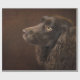 Das Design zeigt ein fotografisches Portrait eines Hundes mit braunem Haar auf dunkelbraunem Hintergrund.