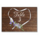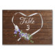 Weißes Bandherz mit lila Blumenstrauß und Efeu auf brauner rustikaler Tischnummer aus Stallholz. Alle Texte können geändert werden.