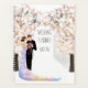 Eine schöne Abbildung einer Braut mit einem pastellfarbenen lila Kleid, das einen langen, blumengeschmückten Weg hat. Sie starrt stehend auf den Bräutigam und hält einen rosa Strauß. Sie sind von hübschen, weichen Rosa- und Weißbäumen gerahmt, die mit Blume in voller Blüte gefüllt sind. Personalisieren Sie Ihr Monogramm.