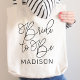 Moderne und lässige schwarze Kalligrafie-Drehbuch "Bride to Be" Frauenhochzeit Tote-Tasche mit individuellem Text, der mit dem Vornamen der Braut personalisiert werden kann. Perfektes Accessoire für den Junggeselinnen-Abschied und das Hochzeitswochenende!