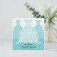 Stilvolle Lackkleidung und Brautkleider in Weiß und aquamarin. Anpassen mit Ihrem eigenen Text. Originalbild von pj_design. Das Bridal Invitation ist ein hochstilisiertes Hochzeitskleid und Brautkleider, die mit Lovebirds, Reben und Beeren dekoriert sind. Die Einrichtung ist mit einem Damast-Muster versehen.