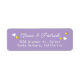 Ihre Zuhause-Adresse ist leicht personalisiert... helles, lila Farblabel mit zwei Textzeilen, die zentriert ausgerichtet sind, und Braut- und Bräutigamen, die in einem stilvollen Script-Schriftart-Stil geschrieben sind, mit dem Bild von kleinen weißen und goldenen Herzen der Liebe.