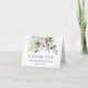 Modernes elegantes botanisches Brautparty für Grünpflanzen (geklappt) Die Dankeschön-Karte beinhaltet Eukalyptus-Blätter, grünes botanisches Blattwerk, staubblaue Blätter, zarte rosa, blaue Blume und andere wunderschöne botanische Pflanzen. Trendy Kalligrafie Script. Dusty Blue Back.