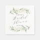 Schöne Brautparty-Servietten mit grünem und goldgelbem Blattwerk im Aquarell-Stil. Text "Brautparty" im kalligrafischen Stil geschrieben.