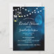 Eine romantische Einladungskarte für ein rustikales Brautparty . Ein dunkelblauer Abend und eine Nacht mit Vollmond- und Saitenlicht. Zwei rustikal bemalte Maurerkrübel mit Kerzen. Vorlagen für Datum, Namen, Veranstaltungsort und UAWG. Der Name ist mit einem modernen handgeschriebenen Stilskript geschrieben. Weiße Buchstaben.