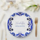 Blue Majolica Mexican Talavera Spanisch Französisch Mittelmeer Fliesen Brautparty gedruckte Papier Teller Vorlage. Moderne Aquarellfarben mit blauen Farbtönen mit modernem handgeschriebenem Schriftart personalisierte Tafelgeschirr bedruckte Teller kundenspezifische Tischdekoration