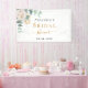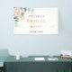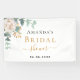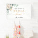 Ein schick weißer Hintergrund. Weiße Blumen, Blume (Pony) und grüne Aquarelltöne, Blätter, Grünpflanzen und ein goldenes Imitat. Personalisieren und fügen Sie den Namen der Braut zu sein und ein Datum. Schwarze und goldene Buchstaben. Kann sowohl als Begrüßungsbanner als auch als Party-Wanddekoration verwendet werden.
