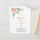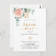 Ein schick weißer Hintergrund. Dekoriert mit einer Rose Gold und rot rosa Blumen, Rose Blume und grüne Aquarell Eukalyptus Blätter, Sprigs, Grün und ein Imitat goldbraun. Personalisieren und fügen Sie den Namen der Braut zu sein und Party Details. Schwarze und goldene Buchstaben.