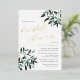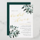 Rustikale, elegante Brautduscheinladung, reich an cremefarbenen Schriftzeichen in schicken Häusern und Kurika mit goldfarbenen Akzenten aus Kalligraphie-Folie, mit Farbsprühen aus Aquarellblättern an den Ecken in satten Grüntönen von Salbei bis Wald und Jäger. Bridal Dusche Einladungen kehren zu soliden dunklen Smaragdgrün.
