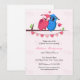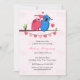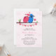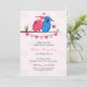 Eine niedliche Brautdusche Einladung mit rosafarbener Mädcheneule und blauer Jungeneule mit stehender Rose auf Zweig mit Herzen. Hintergrund hat ein weiches rosa Herzmuster.