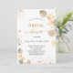 Weißer Hintergrund mit goldenem Eukalyptus und Imitaten goldener Glitzer Staub. Personalisieren und den Namen der Braut zu sein und Party Details. Schwarze und goldfarbene Buchstaben. Zurück: weißer Hintergrund mit goldenen Imitaten Glitzer Staub.