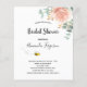 Eine Einladung für eine Braut zu Bienen. Ein schick weißer Hintergrund. Die Rose ist goldfarben, die blühende, rosa Blume (Rose) mit Eukalyptuspflanzen, Blätter und Sprigs sowie die niedliche Hummel mit einem fröhlichen Lächeln. Personalisieren und fügen Sie einen Namen und Party-Details hinzu. Schwarze Buchstaben. Der Text: Brautparty und der Name der Braut, die zu beherrschen ist, sind mit einem modernen handgeschriebenen Stift geschrieben. Zurück: Rose goldene Hintergrundfarbe und die glückliche lächelnde Biene.