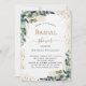 Willkommen in einem eleganten Brautparty. Ein schick weißer Hintergrund. Dekoriert mit grünen Aquarellen Eukalyptusblüten, Blätter, Grünpflanzen, Imitaten goldenen Blätter und goldenen Glitzer Staub. Personalisieren und fügen Sie den Namen der Braut zu sein und Paraty Details. Schwarze und goldene Buchstaben.