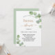 Weiße, mit Eukalyptusgrün dekorierte Untergründe. Personalisieren und den Namen der Braut zu sein und Party Details. Schwarze und goldfarbene Buchstaben. Zurück: grüner Hintergrund.