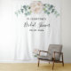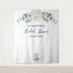 Elegantes, klassisches, modernes Brautparty-Banner, Tapisserie. Weiße, wasserfarbene Bauern, Blume mit Blumen und Eukalyptusgrün. Mit dem Text: Brautparty geschrieben mit einem modernen, schwarz gefärbten Handschrift Stift Skript. Personalisieren und fügen Sie den Namen der Braut und ein Datum. Kann als Begrüßungsbanner, Wanddekoration für das Brautparty oder als Foto verwendet werden.