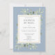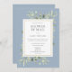 Mit grünen Aquarellfarben Eukalyptus-Blätter auf einem staubblauen Hintergrund. Dieses elegante Brautparty oder die Pärchendusche mit der E-Mail laden zur Entspannung und Entspannung ein. Fügen Sie Ihre Feierinformationen in der modernen Typografie hinzu, um die perfekte Einladung zu schaffen. Entwickelt von Thisisnotme©
