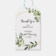 Diese tropischen grünen Blätter Brautparty Geschenkmarken sind perfekt für ein Ziel Brautparty feiern. Das Design besticht durch handbemalte grüne Blätter, die einen goldenen geometrischen Rahmen schmücken.