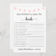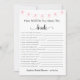 Das Brautparty "Wie gut kennst du die Braut?" ist eine unterhaltsame und interaktive Methode, um dein Wissen über die Braut zu testen! Dieses druckbare oder professionell bedruckte Spiel bietet einen überwiegend weißen Hintergrund mit einer schönen Serie von rosa Hängelampen an der Seitenspitze und verleiht Ihrem Brautparty eine elegante Touch. Unter dem Titel des Spiels "Wie gut kennst du die Braut" findest du Platz, um den Namen der Braut und das Datum ihres besonderen Tages hinzuzufügen, was dieses Spiel zu einer wirklich personalisierten Ergänzung zu den Brautparty-Festlichkeiten macht. Der schwarze Text der Fragen hebt sich vor dem hellen Hintergrund ab und macht sie einfach zu lesen und zu beantworten. Mit 15 individuell anpassbaren Fragen, dieses Spiel wird sicher Stunden der Unterhaltung für Gäste aller Altersgruppen bieten. Egal, ob Sie die Trauzeugin, der beste Freund der Braut oder einfach nur ein Gast beim Brautparty sind, dieses Spiel ist eine großartige Möglichkeit, die Braut besser kennenzulernen und Lachen mit Freunden und Familie zu teilen. Wählen Sie das Spiel auf der Zuhause für eine DIY-Touch aus oder bestellen Sie professionell gedruckte Exemplare für ein poliertes Finish. Egal welche Option Sie wählen, dieses Brautparty-Spiel wird sicher ein Hit sein und dauerhafte Erinnerungen für die Braut und ihre Gäste schaffen. Verpassen Sie nicht diesen lustigen und aufregenden Weg, die zukünftige Braut zu feiern und Ihr Wissen über ihre Lust, Abneigungen und einzigartigen Quirks zu zeigen!