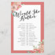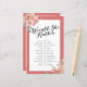 Brautparty Spaß würde sie eher spielen. Personalisieren Sie dieses zweiseitige Spielblatt, indem Sie den Namen und das Duschdatum der Braut hinzufügen. Bitte Karo aus der gesamten Kollektion, um weitere passende Artikel zu sehen.