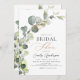Feiern Sie die Braut-in-Stil mit unserer wunderschönen eukalyptus Brautdusche Einladung. Dieses wunderschöne Design mit eleganten Eukalyptus-Blätter vor einem sanften, neutralen Hintergrund macht es zur perfekten Wahl für ein botanisches Brautparty. Mit unserer atemberaubenden Eukalyptus-Brautdusche machen Sie den besonderen Tag der Braut noch unvergesslicher. Mit seinem schönen Design und seinen individuell anpassbaren Optionen ist es der perfekte Weg, die Freude und Spannung der kommenden Neuheiten mit Familie und Freunden zu teilen. Bestelle noch heute!