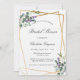 Ein stilvoller weißer Hintergrund auf der Vorderseite. Mit Eukalyptus und Lavendel-Blumen dekoriert. Ein Imitat goldener geometrischer Rahmen. Personalisieren und fügen Sie einen Namen und Details. Zurück: grüner grauer Hintergrund.