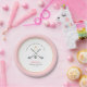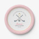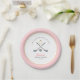 'Letzter Schwung vor dem Ring' Einfache und elegante Rosa und Weiß Golfing Thema Brautparty Party Papier Teller mit handgemalten Aquarellgolfklubs und Ball.