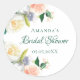 Ein trendiger Aufkleber für ein Brautparty. Weiße, weiße Rose in Aquarellfarben, Rosa mit Rosa und Korallen mit grünem Blattwerk. Eleganter weißer Hintergrund. Vorlagen für den Namen und das Datum der Braut. Mit dem Text: Brautparty geschrieben mit einem handgeschriebenen Stil Skript. Grüne Buchstaben.