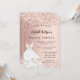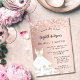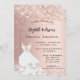 Eine moderne, stilvolle und glamouröse Einladung für ein Brautparty. Rose Gold, Farbverlauf mit Konfetti und weißem Kleid. Der Name ist mit einem modernen handgeschriebenen Stilskript geschrieben. Personalisieren Sie Ihre Party-Daten und fügen Sie sie hinzu.