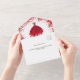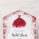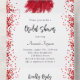 Weiße Kulisse mit roten Konfetti, Glitzern und rotem Kleid. Personalisieren und fügen Sie einen Namen und die Details. Schwarze Buchstaben.