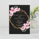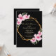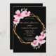 Eine elegante tropische Sommerfrische. Mit einem geometrischen Rahmen in goldenem Imitat, der mit rosa Hibiskus dekoriert ist, Blume tropische Blumen mit etwas Grün. Schwarze Hintergrundfarbe Der Text: Brautparty und der Name der Braut, die sein soll, werden mit einem modernen Handgeflecht geschrieben. Goldener Text. Zurück: schwarze Hintergrundfarbe.