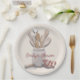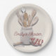 Teller aus Küchenpapier mit Brautparty mit Sondertext. Ein mit Holzlöffeln gefüllter Keramik-Backstein ist das Bild auf bräunlichen Tellern. Ein Küchenhandtuch und ein Teigmischer mit roter Streifen sind ebenfalls Teil des Küchendesigns. Der Name der Braut kann mit eingeschlossen werden, wie z.B. "Emily’s Shower".