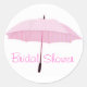 Hübscher Umschlag Aufkleber aus Brautparty, mit einem runden Aufkleber in weißem Hintergrund, mit einer Grafik von einem rosa Schirm und einem rosa Brautparty mit Textlesen. Personalisieren Sie den Text so, dass er Ihren Anforderungen an das Party gerecht wird. Ideal für Brautduschen oder Babyduschen.