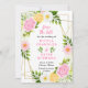 Diese lustige und launige Einladung zur Hochzeit mit dem Hinweis zum Merken des Termins zeigt wasserfarbene rosa, gelbe und weiße Blumen mit Blättern in einem goldenen geometrischen Rahmen. Der Text kombiniert handgeschriebene Schrift und Serifenschriftarten für ein stilvolles und modernes Aussehen. Dies ist perfekt für eine rustikale Hochzeit im Frühling oder Sommer.