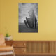 Ein sehr emotionales Bild der Gedenkstätte für die D-Day Landings im Juni 1944 - Les Braves. Diese prächtige Skulptur ist hier in klassisch schwarz-weiß dargestellt. Die Braves liegen etwas rechts vom portraitorientierten Bild mit Sand, Ozean und stürmischer Himmel, die den Rahmen um sie herum füllen