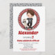 Die Einladung dieses Jungen zum Geburtstag enthält einen niedlichen braunen Haarjungen mit seinem Skateboard. Auf coolem grauem und rotem Hintergrund.