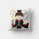 Ein braunes Zauberkissen, das für den kleinen Zauberer gut geeignet ist, mit einem Hut mit einem weißen Kaninchen, Zauberstab, Ringen, Sternen und natürlich dem braunhaarigen Zauberer!