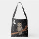 Die gesamte bedruckte Karosserietasche hat eine braune Eule mit goldenen Augen, die eine blaue Halskette trägt, die auf einem schwarzen Hintergrund auf einem Baumzweig sitzt, mit weißen Sternen und einem weißen Halbmond auf Vorder- und Rückseite.