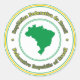 A silhouette of the country of Brazil is at the centre of this design. The text that features above and below the silhouette is in English and Portuguese. The colours of the design are taken from the colours of the Brazilian flag.