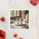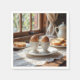Two boiled eggs sit upright in elegant egg cups on a wooden table, with sunlight filtering through lace curtains and casting soft shadows.
