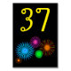 Dieses Tischkartendesign zeichnet sich durch eine anpassbare Zahl ab, die über einem brandstiftenden Feuerwerk-ähnlichen Muster verschiedener Farben liegt.
