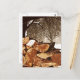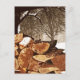 Auf dieser Postkarte befindet sich ein Haufen Feuerholz. Das Holz ist im Schuppen gestapelt. Jenseits des Waldhaufen ist eine kalte, schneebedeckte winterliche Szene.
