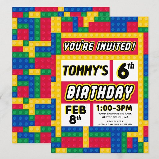 Brick Builder anpassbare Geburtstagseinladung für Ihre Brick Building Theme Party! Feiern Sie mit dieser farbenfrohen und lustigen Brick & Block Bau Geburtstagsfeier! Vervollständigen Sie Ihre Party mit passenden Dekorationen, Girlanden, Schildern, Gefallenstüten, Gefallen, Gefallen-Aufklebern, Luftballons, Tischdekoration & Dankeskarten!