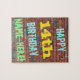 Dieses lustige, zum Geburtstag kommende Puzzle-Design enthält eine Nachricht wie "HAPPY 14. BIRTHDAY, NAME-HERE!", in der der Name personalisiert werden kann. Im Hintergrund ist eine Ziegelwand aus rötlich-braunen Ziegeln dargestellt. Der anpassbare Text der Nachricht weist Farben wie Blau, Gelb und Grün auf und hat ein Aussehen, das von dem eines bemalten Graffiti inspiriert wird. Ein Rätsel wie dieses könnte dazu benutzt werden, jemandem, der seinen vierzehnten Geburtstag feiert und der vielleicht wirklich gerne Rätsel macht, Geburtstagswünsche zu schicken. [~Z0000285]
