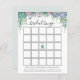 Brautparty Bingokarte mit einer Kaskade aus lila, grünen und staubblauen Sukkulenten, Eukalyptus und Grünpflanzen. Eine unterhaltsame Art, mit Duschgästen zu interagieren, während die Braut sich öffnet ihre Geschenke.