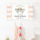 Lasst uns die Braut toasten! Der Begrüßungs-/Display-Banner des Brautparty Wedding ist mit einem stylischen schwarzen Text personalisiert, der mit dem Namen, dem Veranstaltungstitel und dem Datum der Braut werden kann. Die Aufnahme wird durch goldfarbene Toasting Champagner / Mimosa Glasflöten hervorgehoben. Ein goldfarbener Rahmen umgibt den Text, und ein chic Muster mit breiten, horizontalen, rosa und weißen Streifen grenzt an das Design.