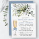 Die moderne elegante Watercolor Botanische Grünpflanzen Brautparty Luncheon Invitation Card beinhaltet Eukalyptus-Blätter, grünes botanisches Blattwerk, staubblaue Blätter und andere schöne botanische Pflanzen. Dusty Blue Back. Champagnerglas mit Dusty Blue Bow.